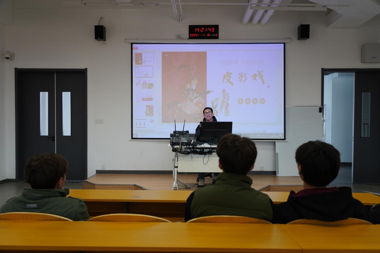 11月18日,第二场文化体验课如期举行。吴国栋老师以皮影戏为主题,结合影像资料介绍皮影戏的历史渊源、美学特征与艺术语言。首先从皮影戏的起源切入,结合图文资料梳理其发展脉络,并通过皮影道具分析了皮影艺术的审美特征。随后带领留学生赏析了皮影戏《劈山救母》选段,通过慢速回放剖析影人关节操控与唱腔念白的配合规律,解析皮影戏的戏剧语言。
