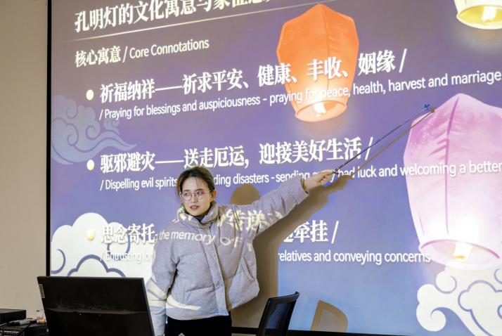 孔明灯制作课程中,刘柳老师向留学生们介绍了孔明灯的文化寓意与象征,孔明灯作为百姓祈福纳祥、驱邪避灾以及寄托思念等美好愿望的载体,承载着重要的文化内涵。老师向留学生们亲自展示了扎制骨架、制作灯体的具体方法,并指导留学生们在孔明灯上写下自己的美好祝愿。留学生们之间的文化虽有差异,对美好的向往却一脉相通。