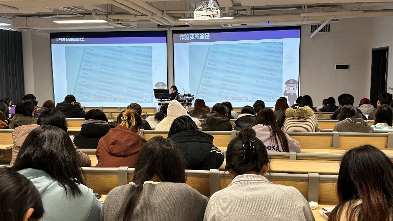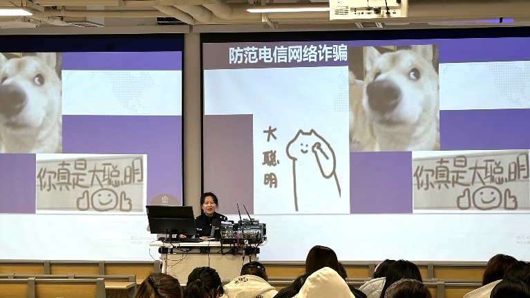 随后,民警又为同学们带来防范电信网络诈骗的专题讲解。结合生动有趣的图片,以及近期高校频发的刷单返利、冒充客服、虚假贷款等典型骗局,民警逐一剖析诈骗分子的作案手法与话术漏洞,并传授“不轻信、不转账、不透露”的防骗口诀。图文并茂的展示让同学们直观感受到诈骗的隐蔽性与危害性。此外,民警还结合校园周边交通状况,强调了骑行佩戴头盔、不闯红灯、远离大车盲区等交通安全要点,倡导文明出行,提醒大家注意交通安全。现场互动频繁、反响热烈,有效提升了大家的识诈、反诈能力及交通安全意识。