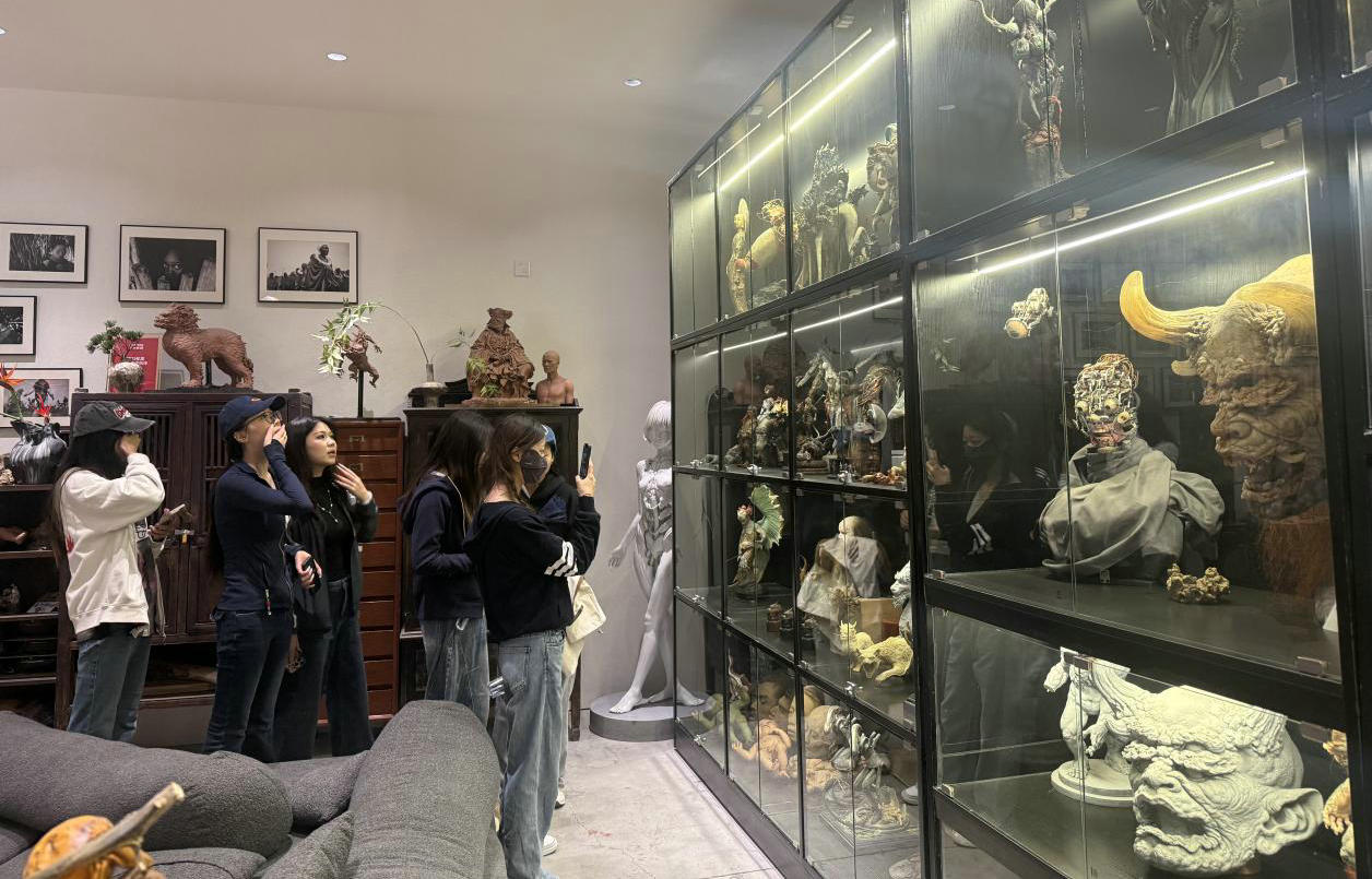 在工作室工作人员的专业讲解与引导下,师生依次参观创作展厅、特效化妆实操间、道具制作车间及IP衍生品设计区,通过现场观摩、案例解析、互动交流等形式,同学们沉浸式体验影视特效制作的工作场景,全面了解影视特效创作全流程。