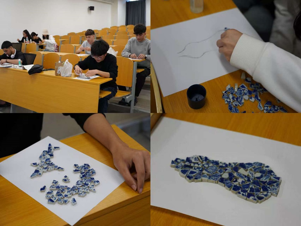 10月14日的文化体验课则以“青花瓷瓷片拼贴”为主题。吴国栋老师为留学生们讲解了青花瓷的发展历程、经典纹样与美学特征,并指导留学生们利用预先准备好的各类瓷片作为创造材料,发挥想象力与创造力,通过设计、拼贴、粘合等步骤,将原本零散的瓷片转化为一幅幅充满设计感的装饰画。这一实践经历不仅能够帮助留学生亲身感受到青花瓷的材质美感与历史温度,更让留学生们在在实践中感悟到传统元素与当代生活巧妙融合。