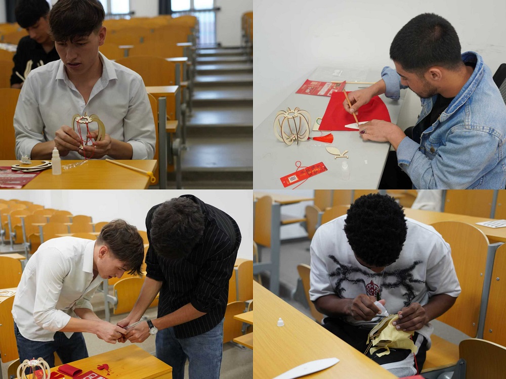 9月23日,中秋节前夕,侯诗诺老师聚焦中秋非遗花灯制作,为留学生们梳理了花灯的历史渊源、风俗象征以及制作工艺,并详细讲解了传统花灯扎制骨架、糊裱灯身、绘制图案等核心制作技艺。并通过视频向留学生展示了滚灯、走马灯等制作技法特殊的花灯,展现中国古代人民的智慧与创造精神。实践环节中,留学生们兴致盎然地动手操作,运用木制框架结构与彩色布料亲手制作出一盏盏独具匠心的花灯。一盏盏花灯映照出留学生们对中国传统工艺的理解与再创造,在愉快的创作过程中感受中国传统文化的博大精深。