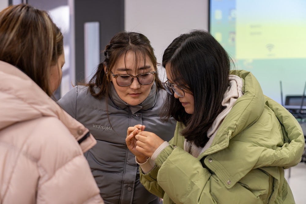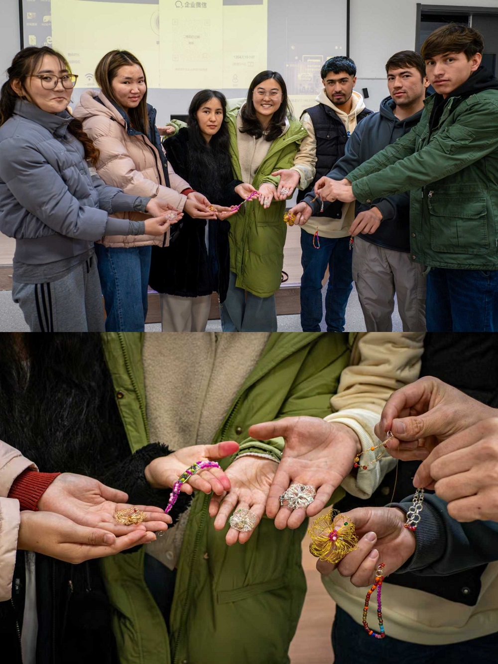 12月2日,武倩老师向留学生们介绍了金属编织的工艺技法,并通过金属材料进行装饰品的创作。武老师带领留学生们将编织工艺与现代金属材料相结合,创作出具有独特风格的艺术作品,留学生们通过缠绕、层叠、塑性等手法,自由发挥创意,将彩色的金属丝线塑造成耳钉、挂件、手链等装饰品,为自己编织出兼具实用性与艺术性的独一无二的工艺作品。