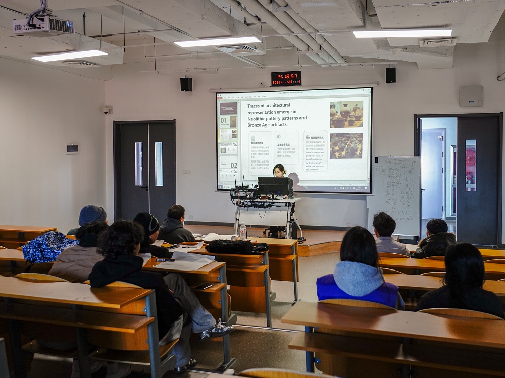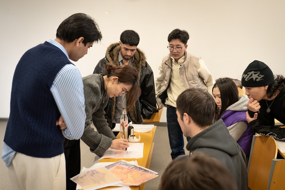 11月25日,刘柳老师以潘鲁生教授“寄情大湾区——潘鲁生艺术作品巡回展”为切入点,向留学生们介绍了潘鲁生教授的艺术创作,并针对界画这一中国传统绘画形式展开介绍,展现中国传统绘画中的严谨技法与美学哲思。讲解过程中,刘老师向留学生们强调了界画作为建筑与艺术相交融的载体的特殊性,以及潘鲁生教授在继承传统绘画技法的基础上,融入现代的设计理念,赋予界画新的生命力的创作方式。通过课程,留学生们不仅学习了界画的历史脉络与原理,学会了新的鉴赏方法,还亲自动手实践,尝试用毛笔作画,感受中国传统书画的笔墨魅力。
