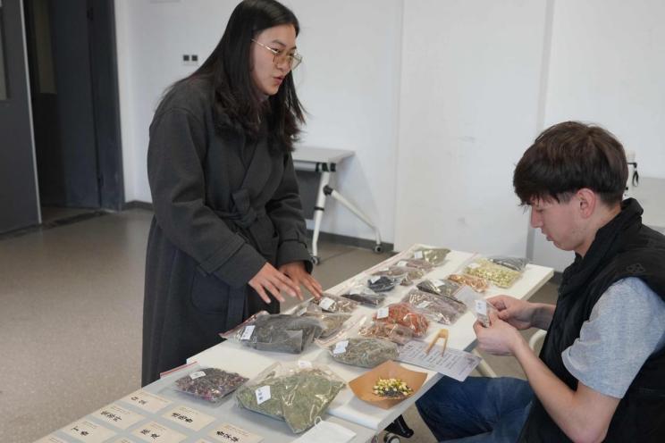 3月26日的香囊制作课程带领学生探索《本草纲目》中记载的芳香辟秽传统智慧。武倩老师带领留学生将时令芬芳带入课堂,让留学生通过辨识艾叶、藿香、丁香等香料,感受草木之韵。老师向留学生介绍了各类香料的药性与配伍讲究,以及中国传统的缝纫技法,指导留学生运用平针、藏针等针法在锦缎上进行自由创作,留下指尖的温度。文化体验课进行过程中充满了温馨和创造性,让留学生们在实践中感受到中国传统女红的精湛技艺与养生理念。