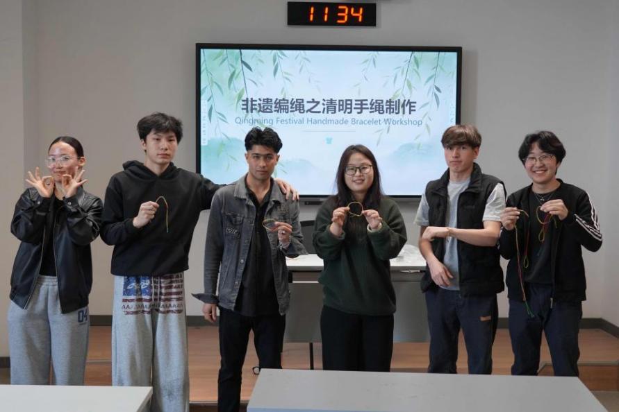 4月2日的手编绳课程引领学生探寻清明时节系柳寄情的古老传统。刘雪琪老师携留学生以指尖缠绕春日追思,让他们触摸棉线、丝绦、玉珠等材料,体悟结绳之趣。老师为留学生讲解不同绳结的象征与搭配之道,以及中国传统的编结工艺,示范留学生运用蛇结、秘鲁结等技法在彩绳间随心创作,传递手心的暖意。文化体验活动弥漫着雅致与专注,令留学生们在穿引间领略中国传统绳艺的精妙匠心与缅怀之情。