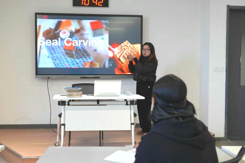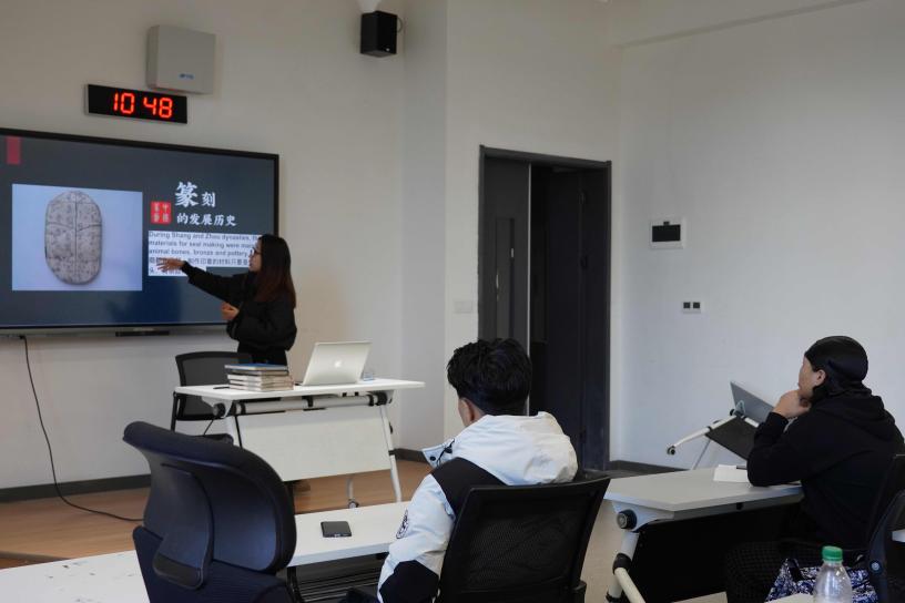 3月19日的文化体验课程围绕传统篆刻展开。魏冉老师带领留学生通过实物观摩、历史图文了解篆刻渊源,通过印石、刻刀、印谱等多种展示方式向留学生展示了篆法布局与刀法运用的技法特色,引导他们学习"朱文凸现""白文凹陷"等富有特色的印章形式差异,以及姓名章、闲章、肖形印等印文类别的文化内涵,让他们体会虚实相生在中国传统艺术中的展现。